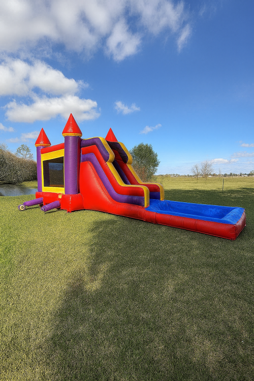 Our awesome 9ft red/purple single lane fun jump and water slide double lane combo for smaller children prioritizes safety and enjoyment. With bright colors, soft surfaces, and compact size, it's perfect for backyard parties or indoor play centers. Features like secure netting, multiple activities, and easy supervision ensure a safe and engaging experience. Durable construction, quick setup, and compliance with safety standards make it ideal for rental businesses. Overall, it provides a fun and memorable play environment that promotes active play and social interaction for younger kids.
