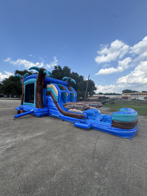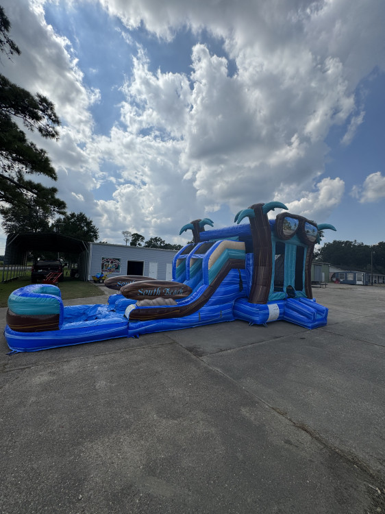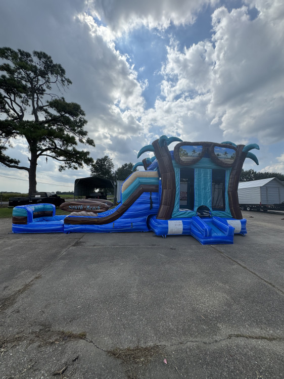 Bring the beach to your backyard with this 9 ft South Beach Double-Lane Combo — a colorful, palm-trimmed inflatable that combines a roomy bounce area with twin climbing lanes and a pair of splash-ready slides. Designed for parties and poolside fun, the enclosed bounce space has mesh windows for airflow and visibility, while the dual climb-and-slide lanes let two kids race down side-by-side into the shallow splash pool. Bright ocean-blue and tropical accents create an island vibe that’s perfect for birthdays, family gatherings, or summer events. Safe, easy to supervise, and built for repeated rental use, this combo offers the excitement of a water slide plus a secure bounce surface all in one compact unit.