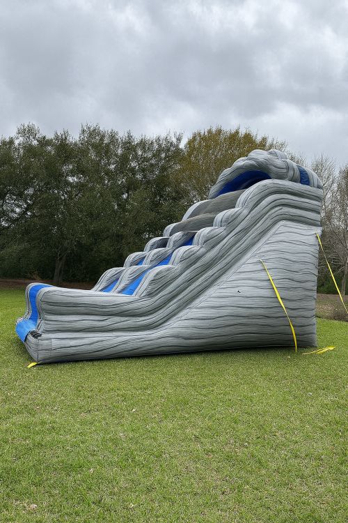 Our 18ft grey marble single lane water slide with a huge pool offers an exhilarating ride with thrilling speed. Equipped with safety features like non-slip surfaces and sturdy handrails, it provides a safe and enjoyable experience. With vibrant aesthetics and sufficient capacity, it's sure to be a hit for all ages rather for a corporate event or birthday party. All of our water slides are cleaned and sanitized after every rental, so you can rest assured that you are going to receive a clean and sanitized water slide every time you book with us!