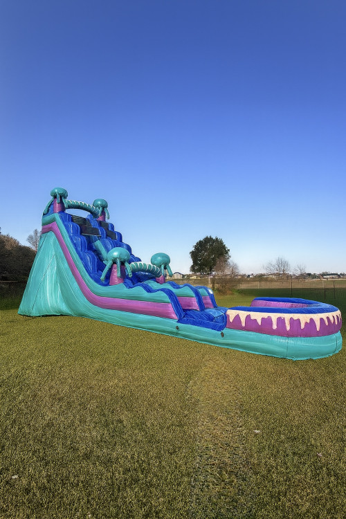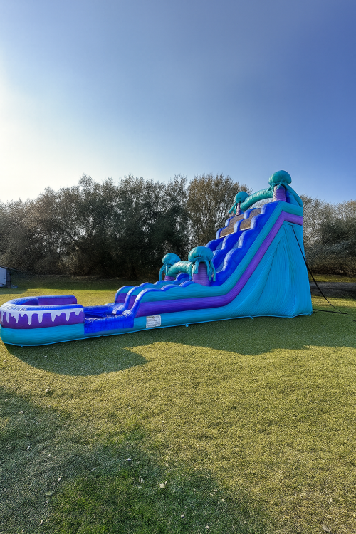 Our 20ft electric single lane water slide with a huge pool offers an exhilarating ride with thrilling speed. Equipped with safety features like non-slip surfaces and sturdy handrails, it provides a safe and enjoyable experience. With vibrant aesthetics and sufficient capacity, it's sure to be a hit for all ages rather for a corporate event or birthday party. All of our water slides are cleaned and sanitized after every rental, so you can rest assured that you are going to receive a clean and sanitized waterslide every time you book with us!