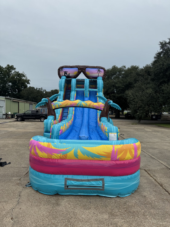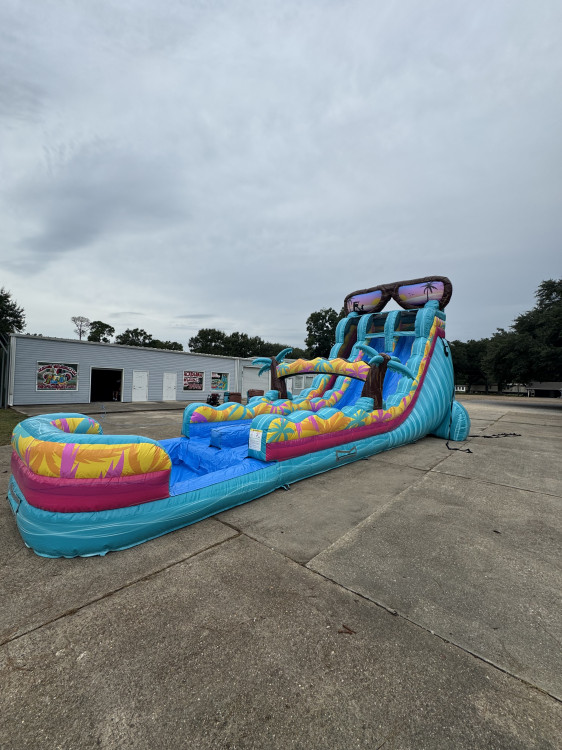 Make a splash with the 20 ft Extended Double-Lane Island Flow — a vibrant, tropical-themed water slide built for thrill-seekers and family fun. This long inflatable features two parallel sliding lanes for head-to-head or staggered racing, a tall 20-foot launch for big, exciting drops, and an extended splash pool at the bottom to cool off after every run. Bright teal, pink, and sunny palm-print graphics plus oversized sunglass detailing give it a beachy island vibe that elevates backyard parties, school events, and corporate summer outings. Sturdy sidewalls, padded lane dividers, and a wide climb make ascents safe and comfortable, while the roomy pool provides a forgiving finish for sliders of all ages. Designed for water play (hoses required), this eye-catching unit brings high-energy action and colorful island style to any outdoor rental event.